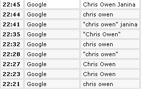 Tullessani lomalta ja katsottuani ensimmäisen kerran laskuria, olin kovin hämmästynyt. Chris Owenia oli haettu vähintään toista sataa kertaa tiistai-illasta lähtien. Mitä helvettiä oli tapahtunut? Oliko taas ollut jossain lehdessä jokin uusi juoru? Yritin selailla nettiä, mutta pikasilmäyksellä en löytänyt mitään. Jäin siihen luuloon, että Owen on patsastellut jonkun julkkislehden kannessa ja kertonut ilkeitä asioita Janinasta.