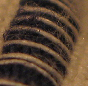 Ohessa hyvin läheinen kuva päiväpeitostani. Mittanauhan puutteessa en osaa sanoa tarkkaa suurennuskerrointa, mutta olettaisin tuon valkoisen langan olevan paksuudeltaan noin millin luokkaa. Pieniä karvoja ei pysty silmällä erottamaan. Missä kohtaa tuossa kuvassa punnertaa itsensä ähkyyn syönyt pölypunkki? Minä en pysty tuosta niitä löytämään ja kuitenkin ainakin parin punkin kuuluisi hymyillä kameralle tuossa fotossa.