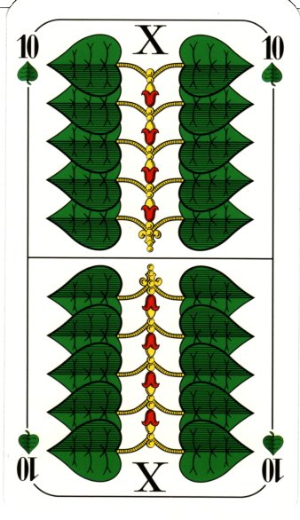 Both packs are excellent in production quality, though. The material is strong and durable. The cards are quite a bit taller than standard playing cards (10 cm or 4" tall, compared to a more typical 8.5 cm) but only slightly wider than usual. Thus, the cards appear tall, which is actually quite nice. All cards have indices - both suit and number - and the tens also have a large "X" in the top middle. Despite indices, Obers and Unters also have the suit symbols in the right place (up in Obers, down in Unters). All cards are double-headed.