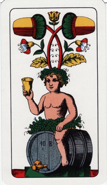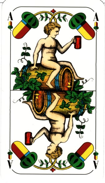 The highlights and identifying features of the pattern are the seated kings and the decorative twos or aces (despite having indices "A", the aces clearly have two suit symbols, betraying their origin as twos). The ace of acorns features a naked cherub sitting on a barrel hoisting a tankard, with plants that look like hops. The ace of bells has a dog fighting a boar. The ace of leaves has a decorative cup with roses and the ace of hearts has Amor with his arrow.
