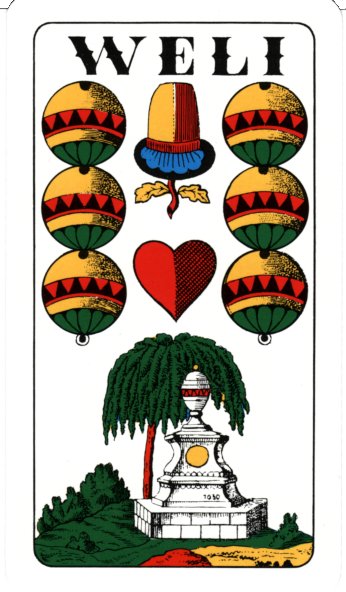 This pack also has a WELI card, that is, the six of bells has a large "WELI" text in the top, an acorn and a heart and a fountain in the bottom. This card is used in some Tyrolean games played with a 33-card pack (number cards 7-10 in every suit and WELI).