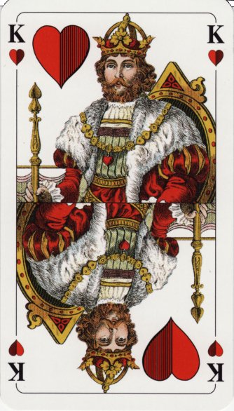 The pattern is not the same as in the Schafkopf / Tarock packs described above, but very close. The kings are also seated, and the twos (or the aces) have mostly the same pictures. However, these cards are single-ended (thus the name Einfachdeutsch; the Bavarian pattern is known as Doppeldeutsch in Austria, where this Salzburger pattern is also used). The court cards are rather beautiful, and the number cards have all sorts of little drawings (animals, hunting scenes, farm life) in the bottoms under the pips.